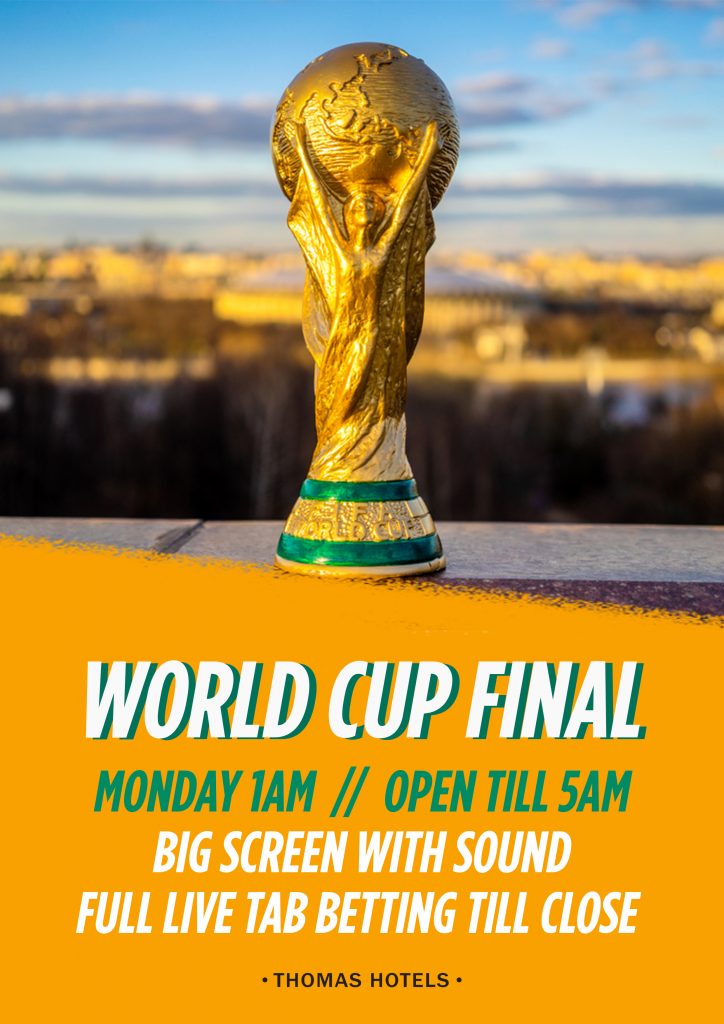 World Cup Final - - - - Tickets: Free Catch the World Cup Final live and loud with us – Monday 1am! We’re staying open till 5am. Full TAB facilities during the game.